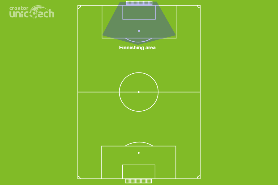 Ostatnim ważnym elementem jest „strefa bezpośredniej finalizacji”. Jaka jest różnica między strefą finalizacji, a strefą bezpośredniej finalizacji? W strefie finalizacji podejmujemy działania mające na celu stworzenie dogodnej sytuacji na zdobycie bramki (podanie prostopadłe, dośrodkowanie, podanie wsteczne, gra na ścianę itp). W momencie, kiedy zawodnik znajduje się w strefie bezpośredniej finalizacji, jego działanie musi być ukierunkowane na bezpośrednie zdobycie bramki (strzał). Strefa ta jest newralgiczna i pada z niej najwięcej bramek, dlatego drużyna musi podjąć jak najwięcej działań, aby to osiągnąć i pozwolić popełnić błąd przeciwnikowi.
