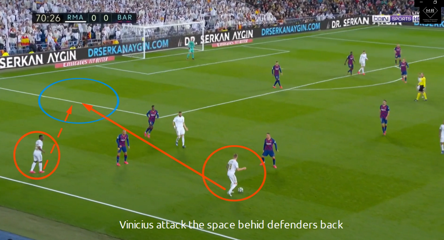 Atak przestrzeni za plecami obrońców przez skrzydłowego jest jednym z fundamentów gry wspomagającym mobilizowanie ataku. Odpowiedni „timing” i ruch powoduje zdobycie wolnej przestrzeni, która bardzo często kreuje się w bocznych sektorach boiska. Na wideo poniżej możecie zobaczyć, jak Toni Kross pokazuje Viniciusowi, aby atakował przestrzeń, w którą za chwilę nastąpi podanie. Nawet na najwyższym poziomie zawodnicy muszą ciągle sobie podpowiadać i komunikować się, aby zdobyć przewagę nad przeciwnikiem. W tym wypadku akcja zakończyła się bramką. Warto dodać, że analizując pracę skrzydłowych, możemy wyróżnić 20 zachowań ofensywnych i defensywnych, które są niesamowicie istotne w procesie rozwoju drużyny oraz samych graczy występujących na tej pozycji.