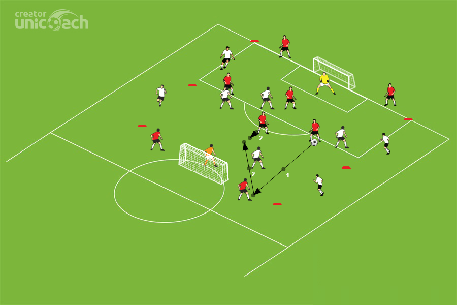 Zwracamy uwagę na ruch między liniami zawodników drużyny utrzymującej się przy piłce oraz wyjście na pozycje zawodników drużyny strzelającej bramki. Akcentujemy fazy przejściowe występujące w grze.