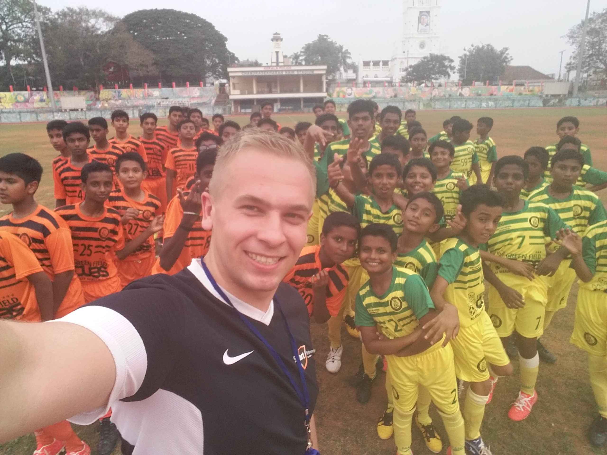 Teraz trochę więcej merytoryki. Przez cały pobyt w Indiach prowadziliśmy nabory w szkołach, selekcje zawodników oraz treningi z grupą, która została wybrana jeszcze przed naszym przyjazdem. Jeśli chodzi o treningi to skupialiśmy się głównie na elementach technicznych oraz na taktyce indywidualnej. Każdy miesiąc planowaliśmy tak, aby poruszyć temat techniczny np. podania i przyjęcia i temat taktyczny np. podanie i przyjęcie piłki dalszą nogą od przeciwnika. Jeżeli chodzi o motorykę to główny nacisk w tym okresie kładliśmy na koordynację ruchową z piłkami oraz bez piłek, np. z wykorzystaniem drabinek. Dodatkowo dobieraliśmy temat mentalny np. koncentracja. W tym wszystkim nie mogło zabraknąć dobrej zabawy i dużo gry w piłkę nożną, aby zawodnicy mogli zakochać się w tej dyscyplinie sportu. Poziom zawodników, głównie jeśli chodzi o rozumienie gry był bardzo słaby. Jednostki musieliśmy budować na małych grach, tak aby chłopcy mogli nauczyć się zadań w ataku i w obronie od podstaw. Mogę jednak dodać, że kilku zawodników było naprawdę na bardzo dobrym poziomie, biorąc pod uwagę umiejętności techniczne.