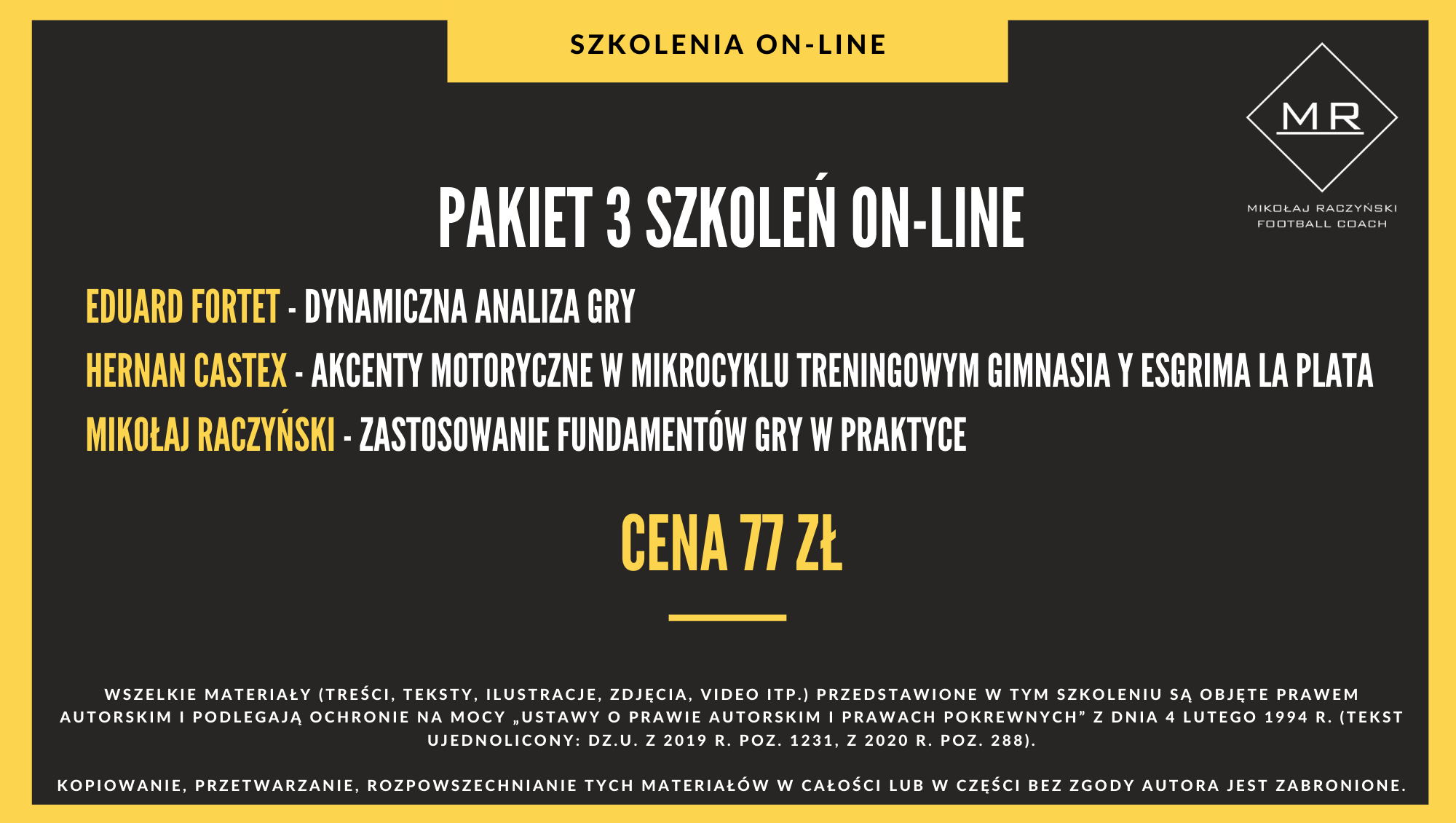 Pakiet 3 szkoleń online to doskonała okazja, aby zdobyć wiedzę z zakresu analizy gry, przygotowania motorycznego oraz fundamentów gry. Dbając o jak najwyższy poziom szkolenia, wykłady zostały poprowadzone przez prelegentów z Hiszpanii, Argentyny i Polski. Premiera wykładów miała miejsce 28.08.2020, a dziś można je obejrzeć z odtworzenia. Co znajdziecie w środku?